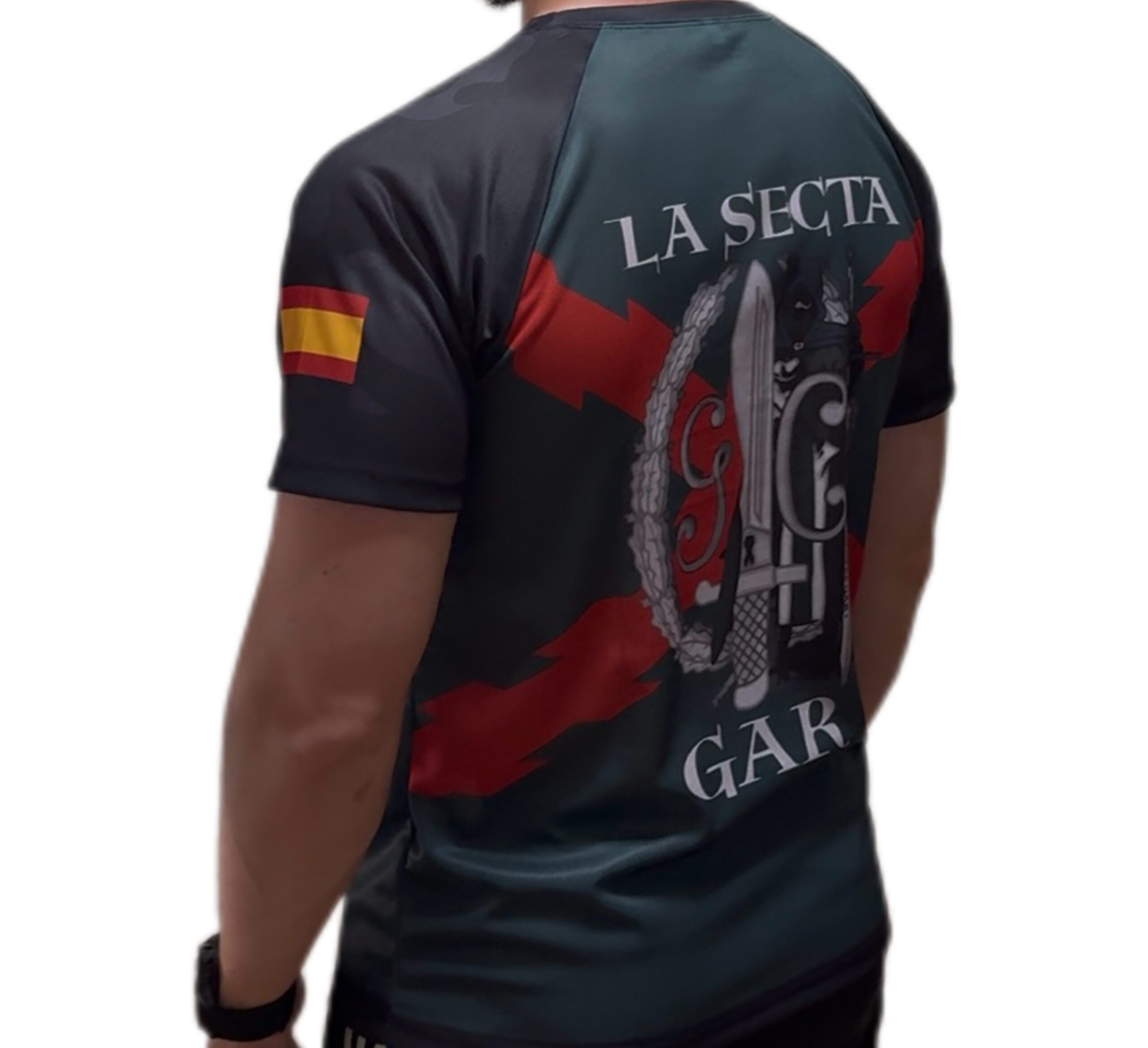 Prepárate para destacar dentro y fuera del entrenamiento. Esta camiseta técnica ha sido diseñada con tejido transpirable de alto rendimiento y un diseño exclusivo que rinde homenaje al GAR (Grupo de Acción Rápida). Presenta un frontal discreto con el emblema oficial del grupo y una espalda potente con el lema «LA SECTA» y una ilustración detallada que representa su identidad. Las mangas negras añaden contraste y llevan la bandera de España en el lateral derecho. Ideal para entrenar, representar a tu unidad o llevar con orgullo. Corte deportivo, cómoda y resistente.