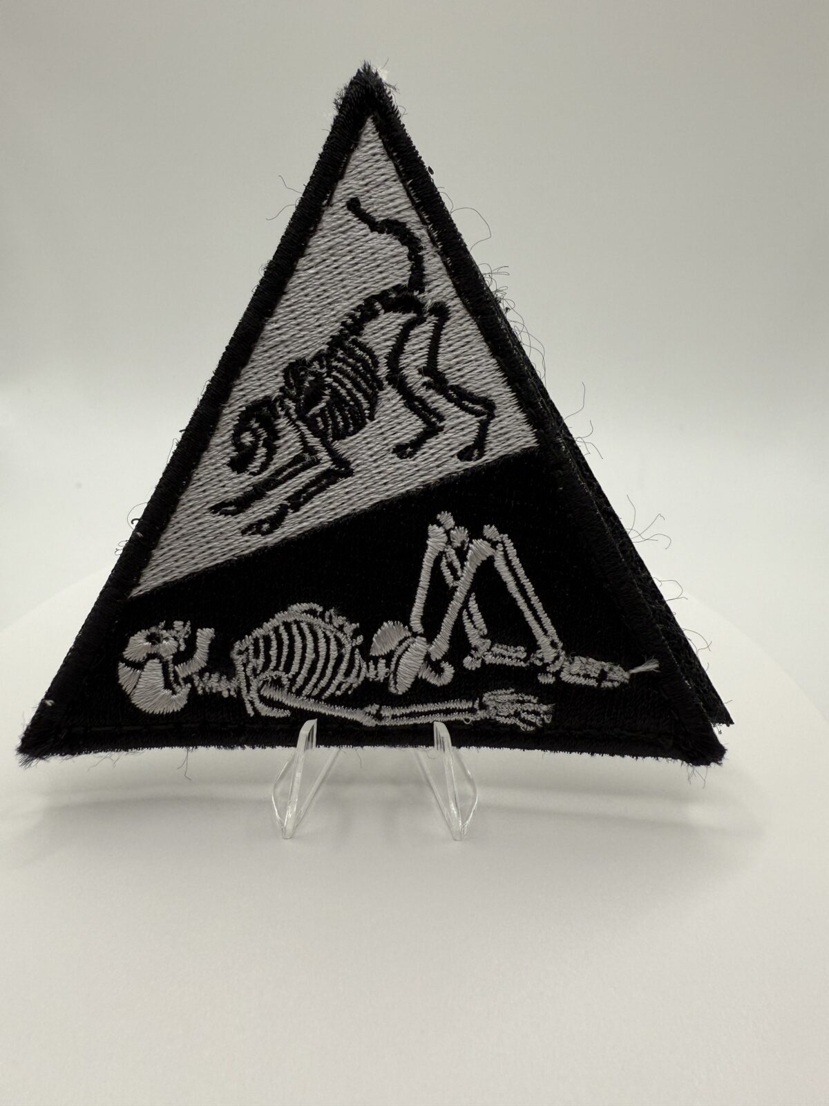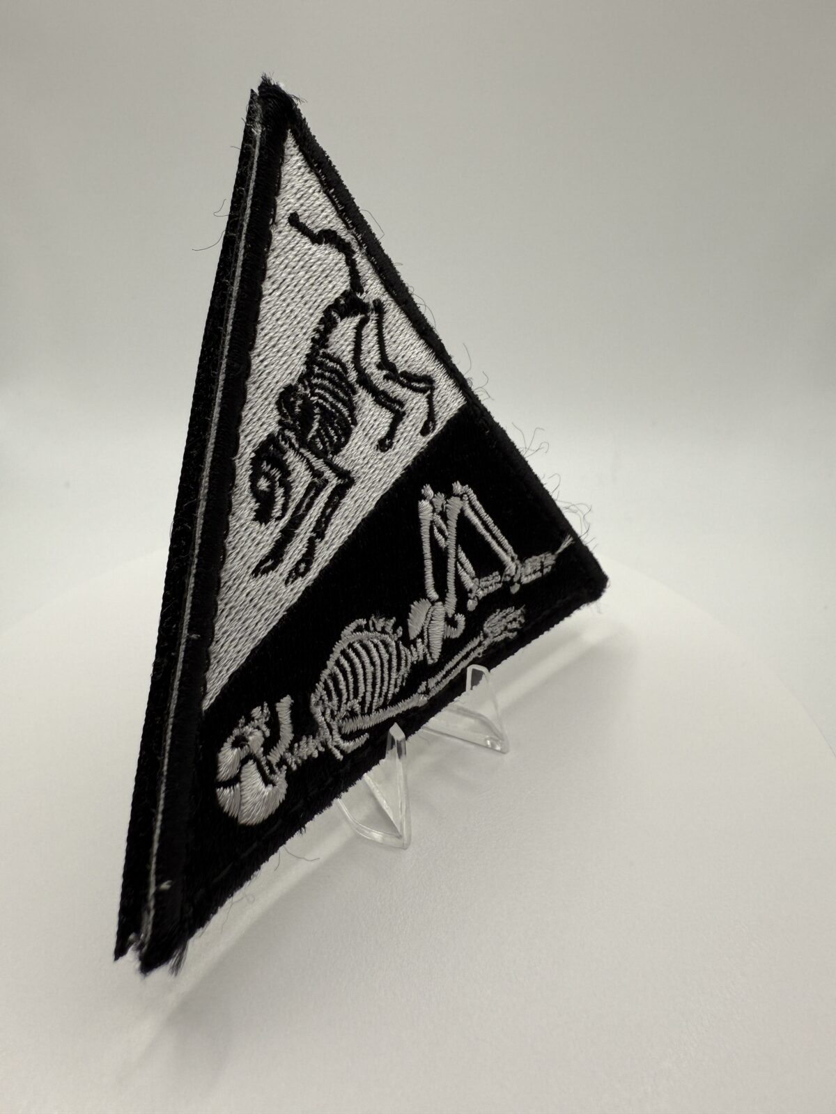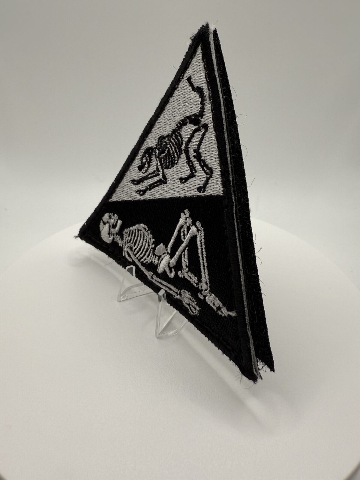Este parche bordado triangular representa de forma simbólica el trabajo incansable de las unidades caninas de búsqueda y rescate. En su diseño, la parte superior muestra el esqueleto de un perro en posición de rastreo, mientras que en la parte inferior aparece el esqueleto de un humano, simbolizando la conexión y el objetivo de estas unidades: localizar restos humanos en misiones críticas. Su diseño en blanco y negro otorga un estilo sobrio y profesional, ideal para misiones tácticas y de rescate.
