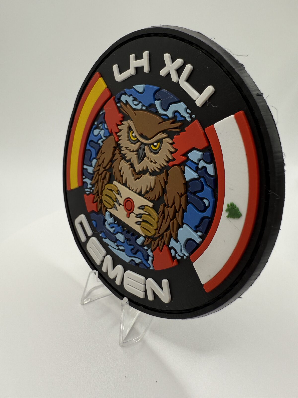 Enmarcado por los colores de las banderas española y libanesa, este diseño rinde homenaje a la cooperación internacional y al compromiso de los soldados en esta misión de paz. La cruz roja detrás del búho simboliza protección y auxilio, mientras que el contorno negro con el texto “CEMEN” y “LH XLI” resalta el nombre y la misión del destacamento.