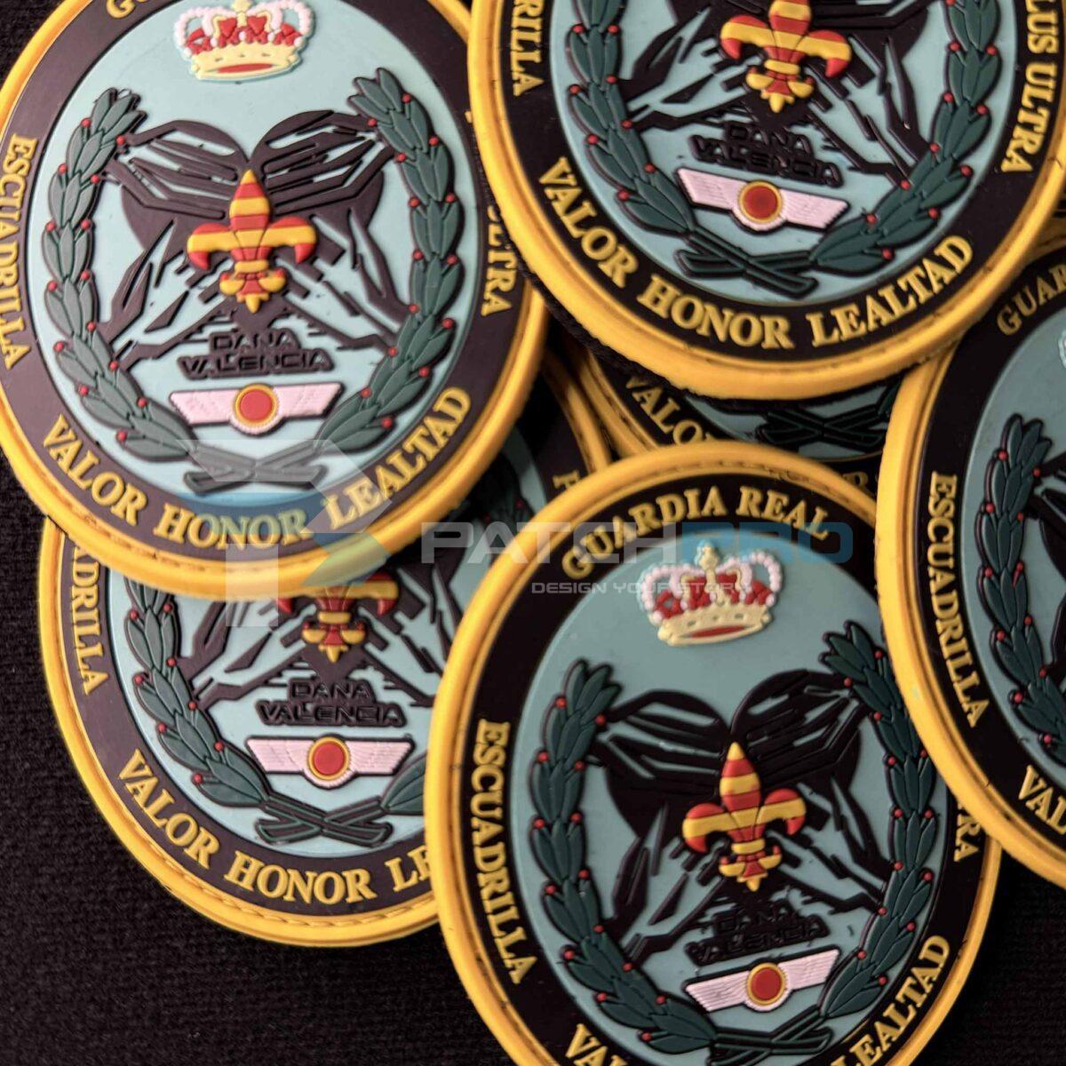 El parche de PVC de la Guardia Real – Escuadrilla ‘DANA’ es un distintivo que encapsula los valores fundamentales de esta unidad militar de élite. En su diseño se aprecia la simbología característica de la Guardia Real, con dos cañones cruzados que simbolizan la defensa y la fuerza, enmarcados por una corona real, que representa la lealtad a la institución monárquica. La flor de lis, situada en el centro, es un emblema de honor y pureza, reforzando los ideales de la unidad.