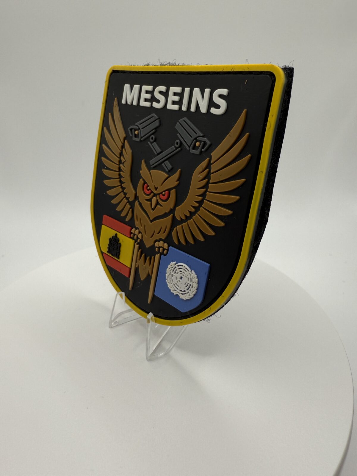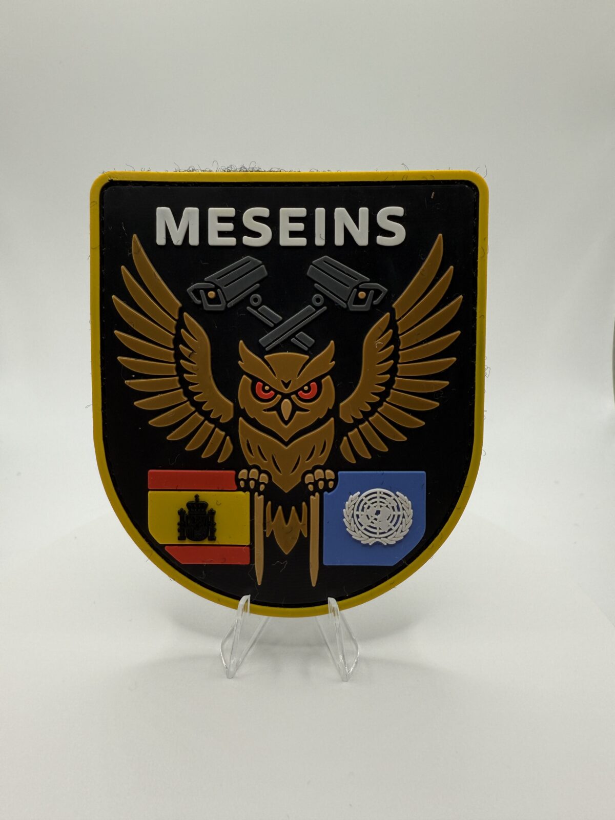 El parche MESEINS simboliza la vigilancia, precisión y compromiso de los equipos de misiones internacionales y operaciones de mantenimiento de la paz.