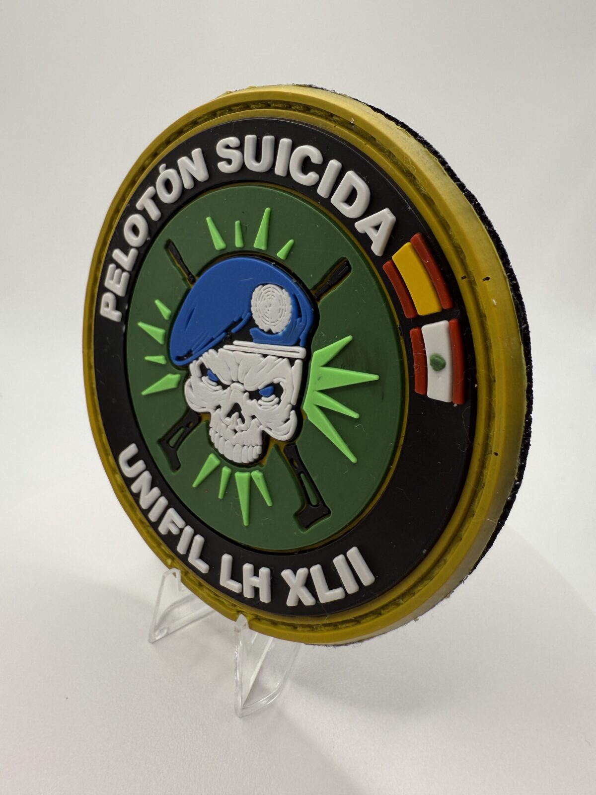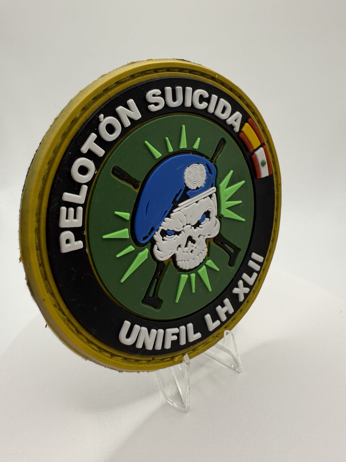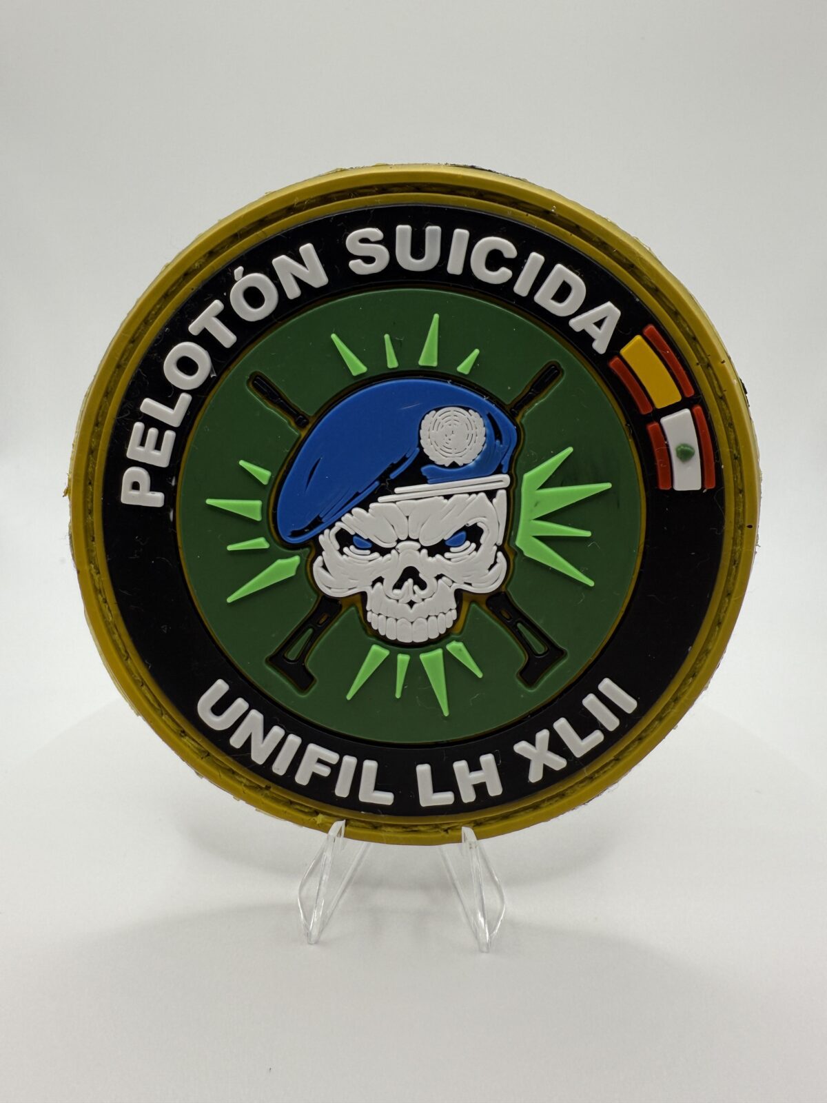El parche de PVC Pelotón Suicida – UNIFIL LH XLII simboliza el compromiso inquebrantable y el valor excepcional de esta unidad en la misión de paz en el Líbano. En el centro, una calavera desafiante lleva una boina azul, emblema de las fuerzas de la ONU, con dos fusiles cruzados detrás que representan la defensa y la acción. El fondo verde, rodeado de rayos y las banderas de España y el Líbano, destaca la dualidad de compromiso internacional y orgullo patrio.