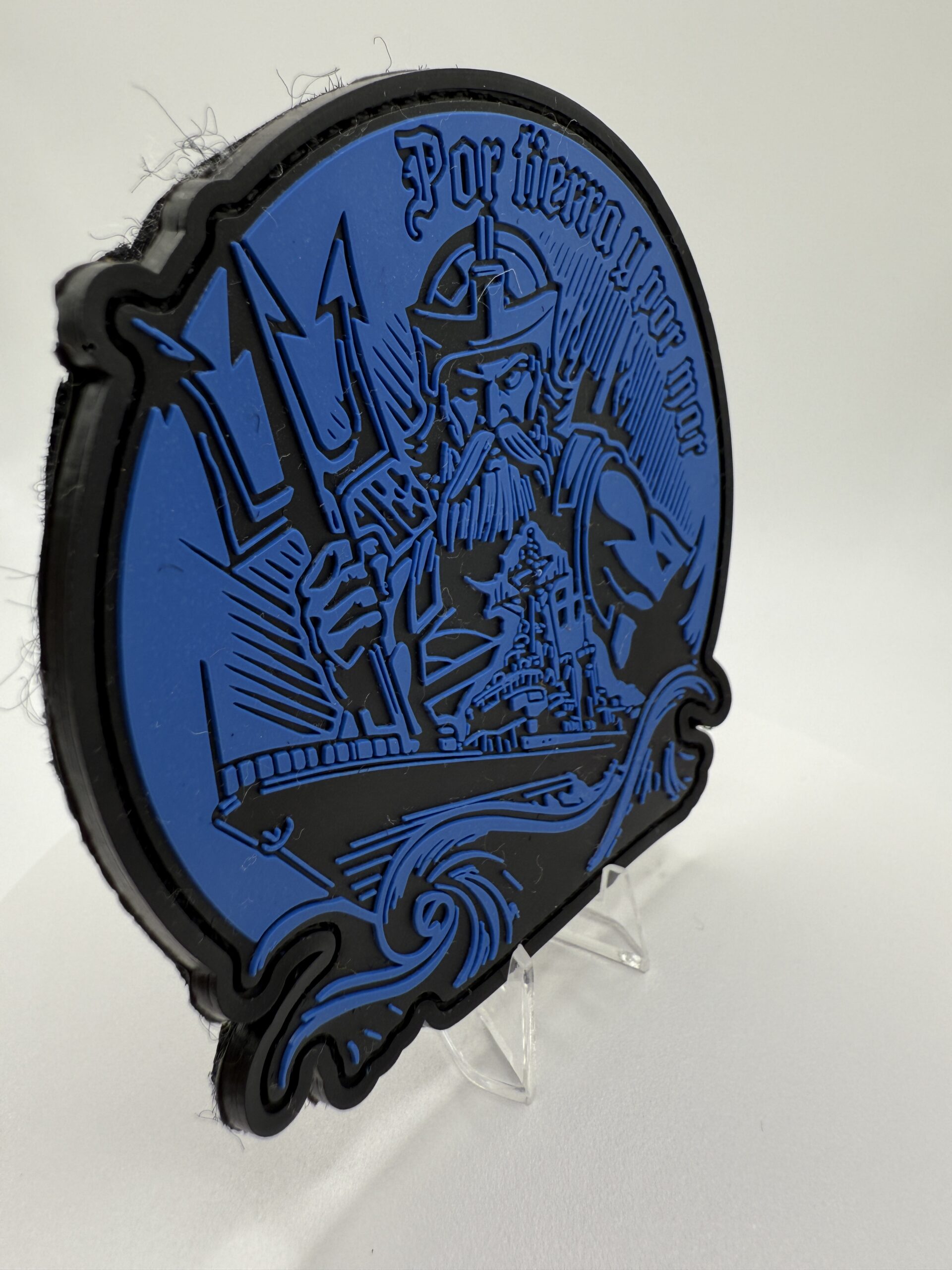 Con un diseño que evoca la grandeza del Imperio Español y rinde homenaje a los grupos de operaciones especiales, este parche captura la esencia de quienes dominan tanto el mar como la tierra. Fabricado en PVC de alta calidad y con un tamaño aproximado de 8 cm, este distintivo presenta una impactante ilustración de un guerrero con tridente, símbolo de poder y conexión con el mar, junto a un imponente buque de guerra que refuerza el espíritu naval y táctico.