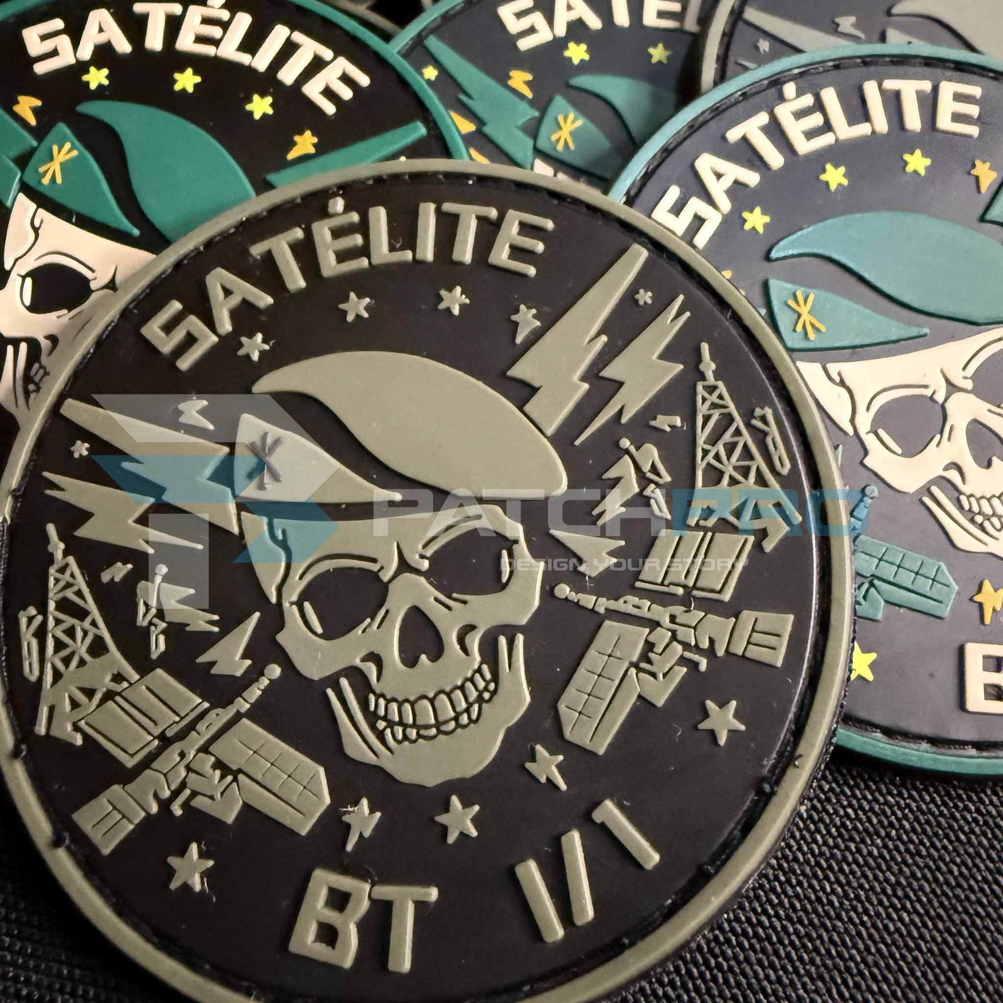 Parche de PVC de alta calidad de 8 cm para la Sección Satélite BT I/1 del RT 1 de Huesca. Con una calavera central y elementos de comunicación como satélites y antenas, este diseño combina durabilidad y simbolismo, ideal para quienes valoran el orgullo y la precisión operativa.