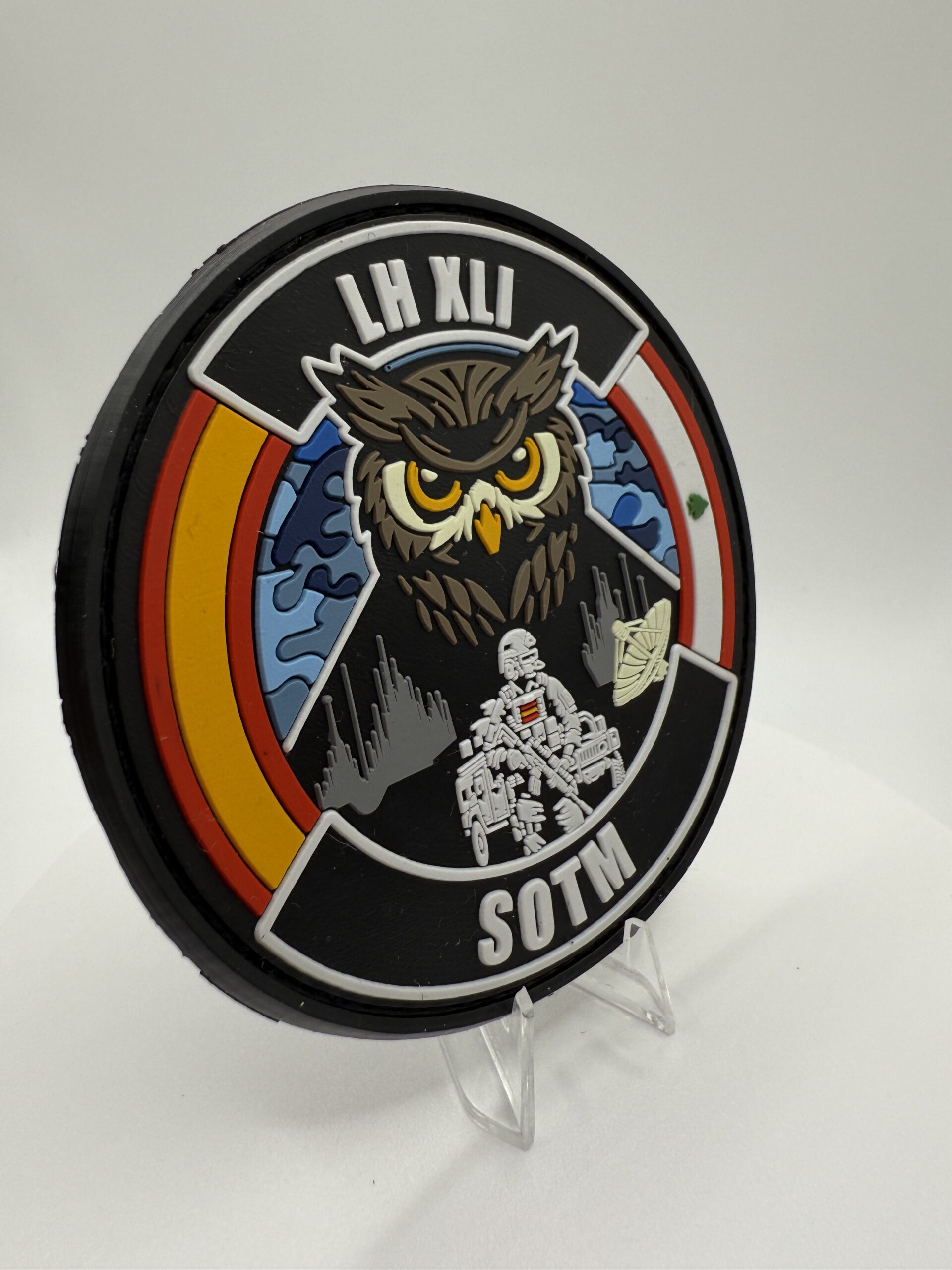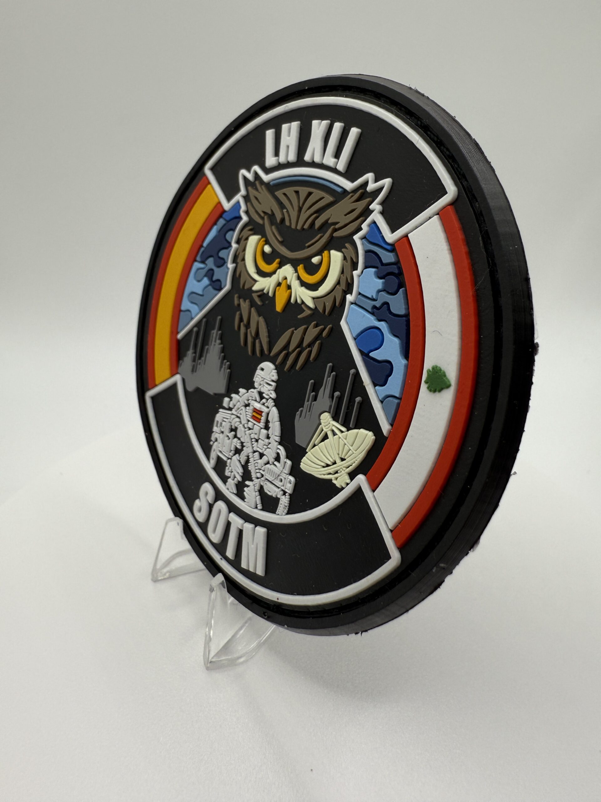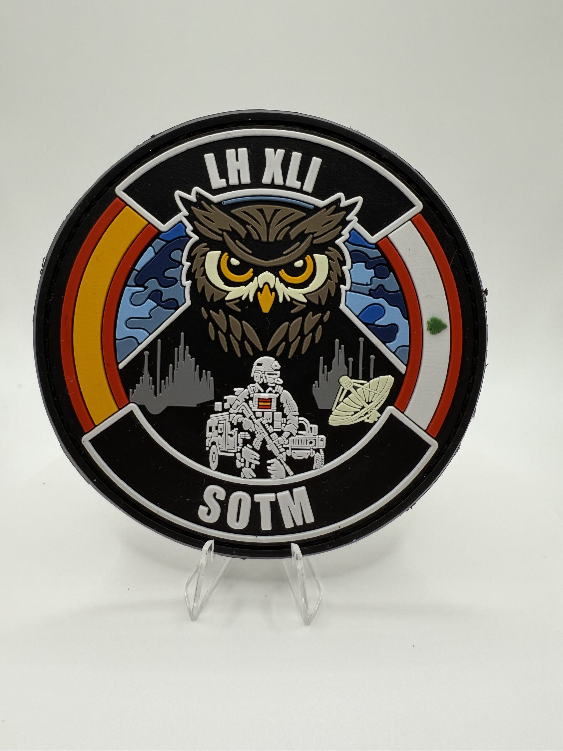 El parche PVC «SOTM UNIFIL – LH XLI» representa la fuerza y dedicación de las unidades de transmisión y comunicaciones desplegadas en la misión de paz en Líbano. Con un diseño detallado y simbólico, el búho, símbolo de la vigilancia y la inteligencia, se posiciona al centro sobre un fondo de camuflaje azul y gris, representando el entorno táctico de operaciones.