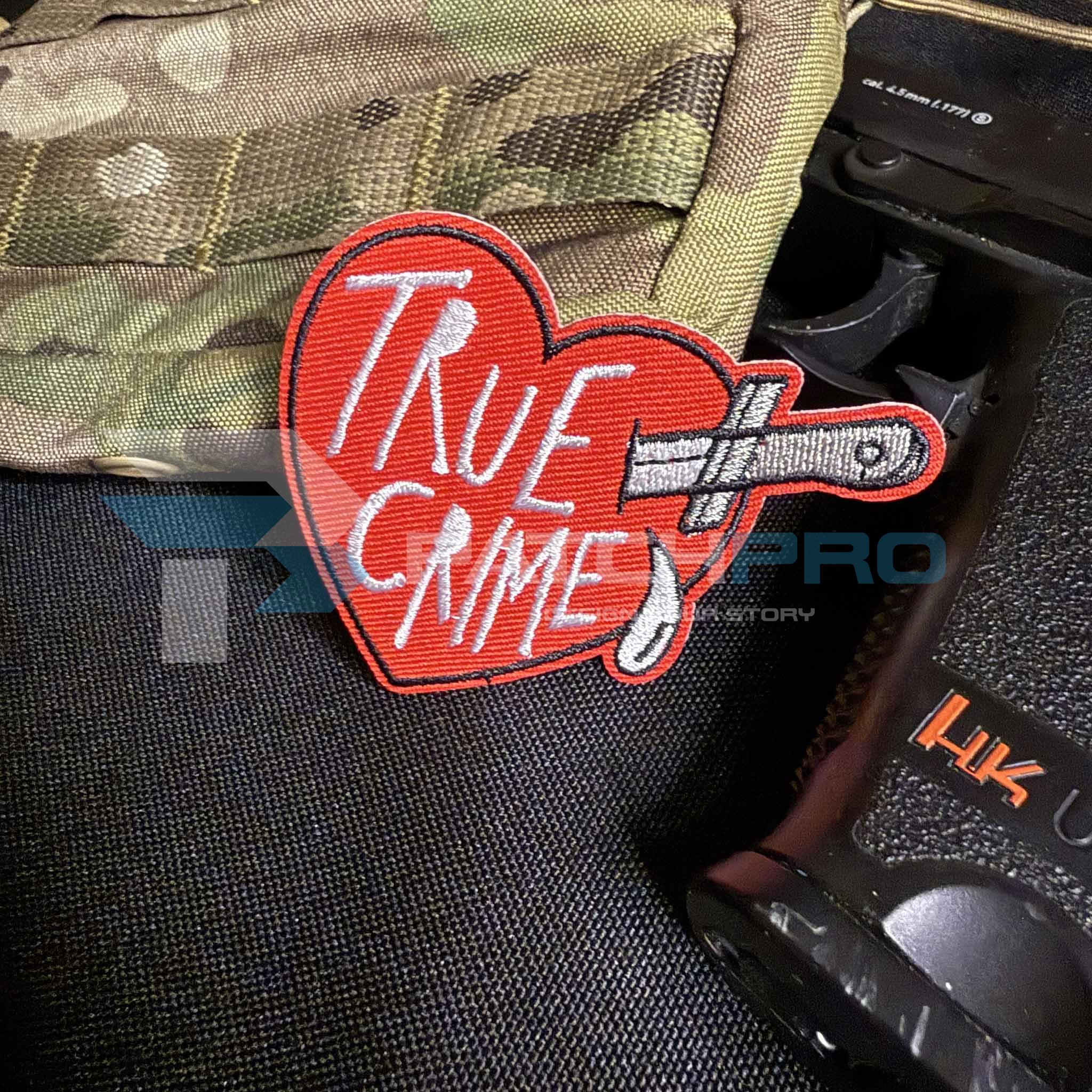 El parche «True Crime» presenta un corazón rojo atravesado por un cuchillo, con una tipografía retro y llamativa. Ideal para los fans de las historias de crímenes reales y el estilo alternativo.